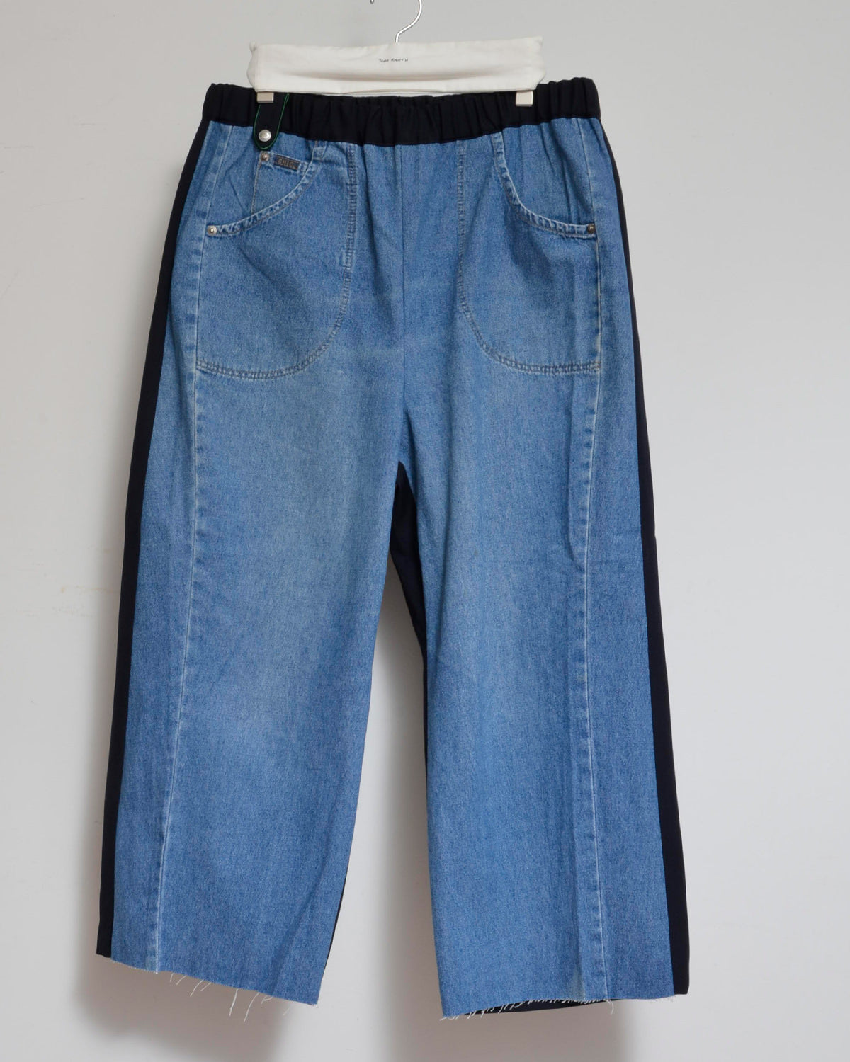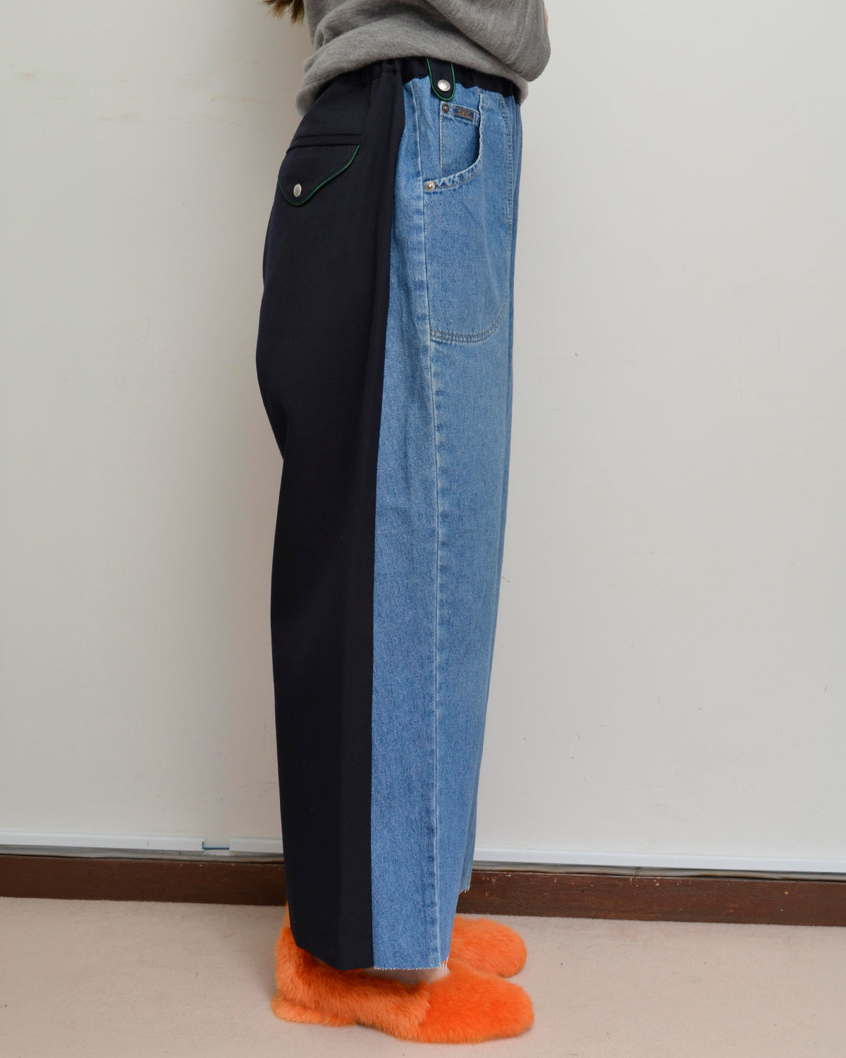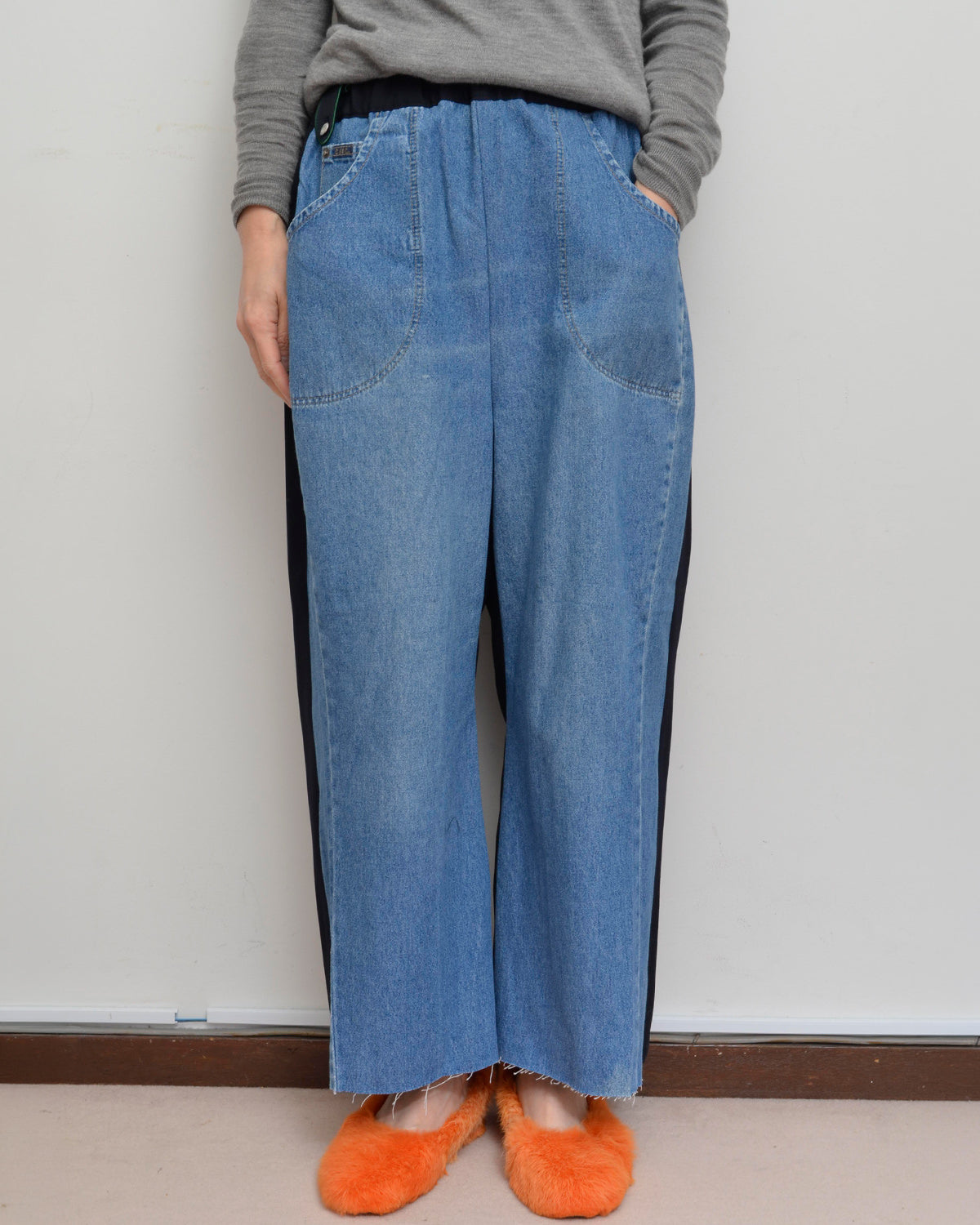 前身頃にはusedデニムのイージーパンツを大胆にそのまま使用し、ポケットも古着のディテールを活かしています。