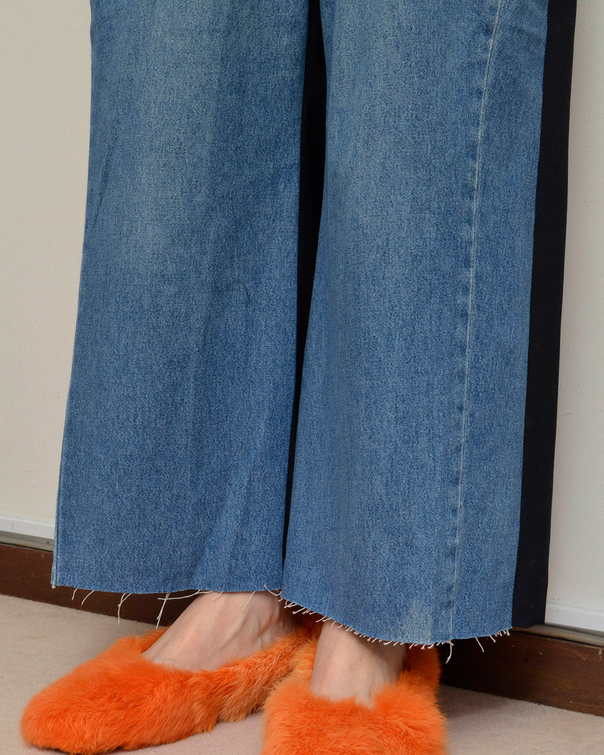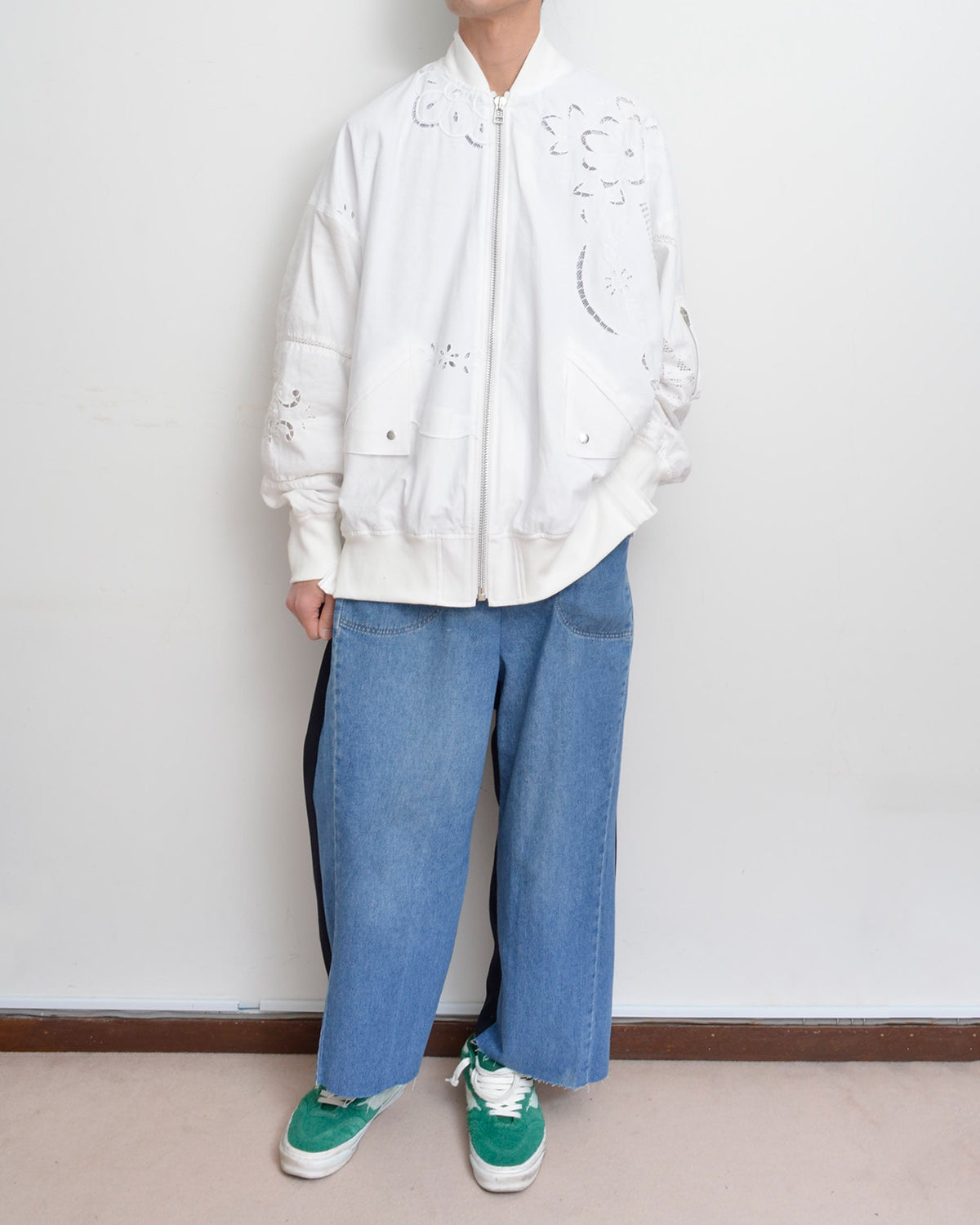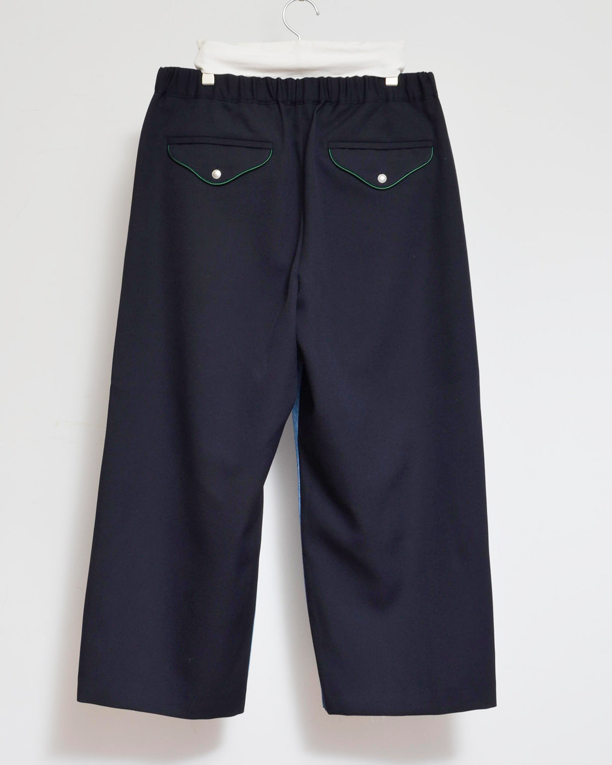 前身頃にはusedデニムのイージーパンツを大胆にそのまま使用し、ポケットも古着のディテールを活かしています。