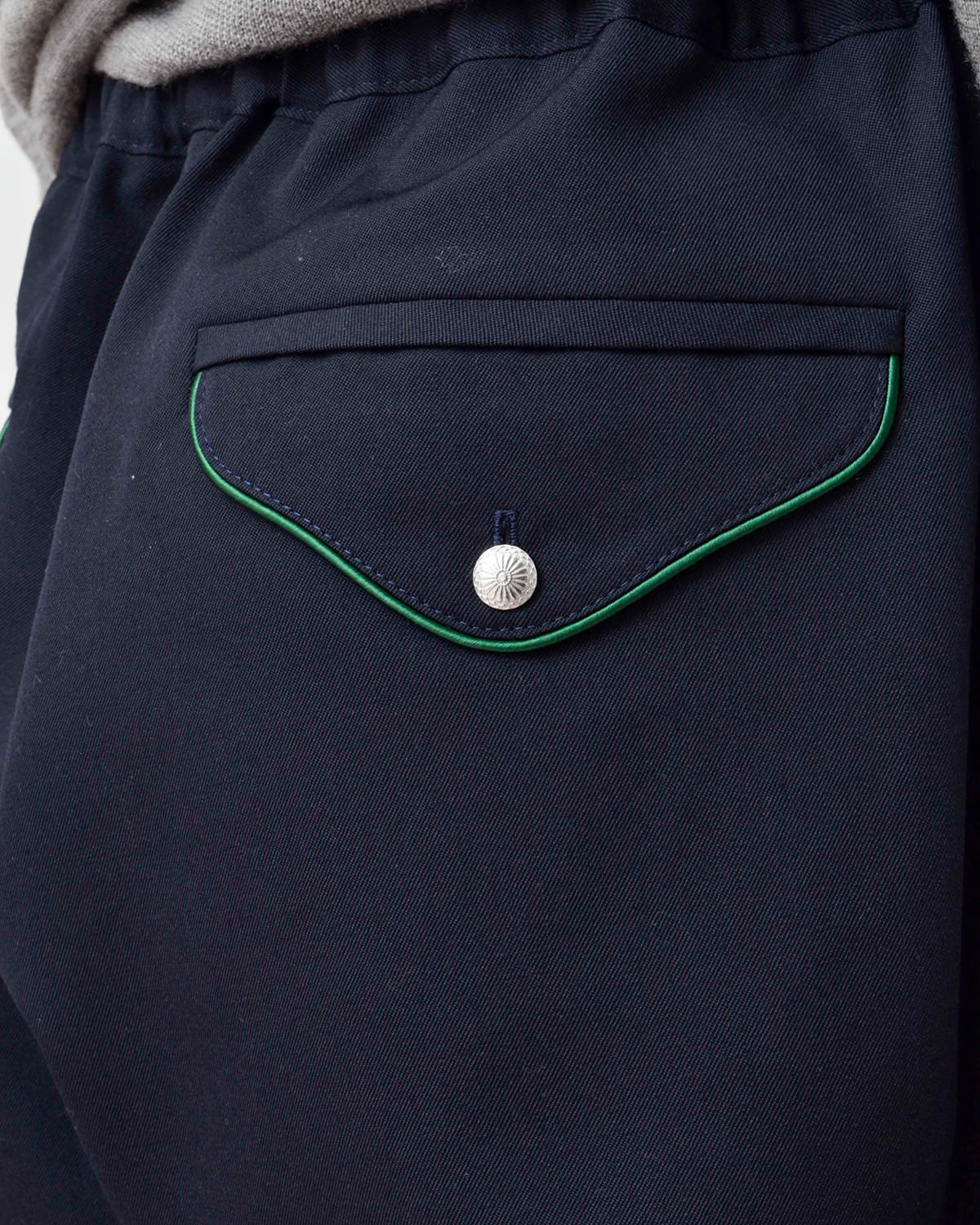 コードパイピングやコンチョボタンを配し、ウエスタンテイストを感じさせる仕上がりに。