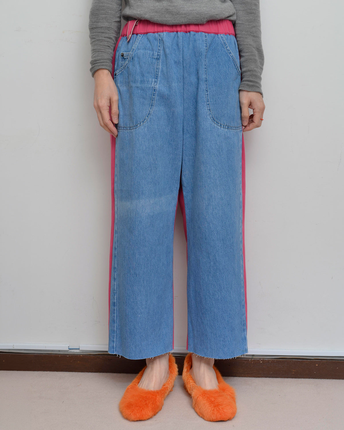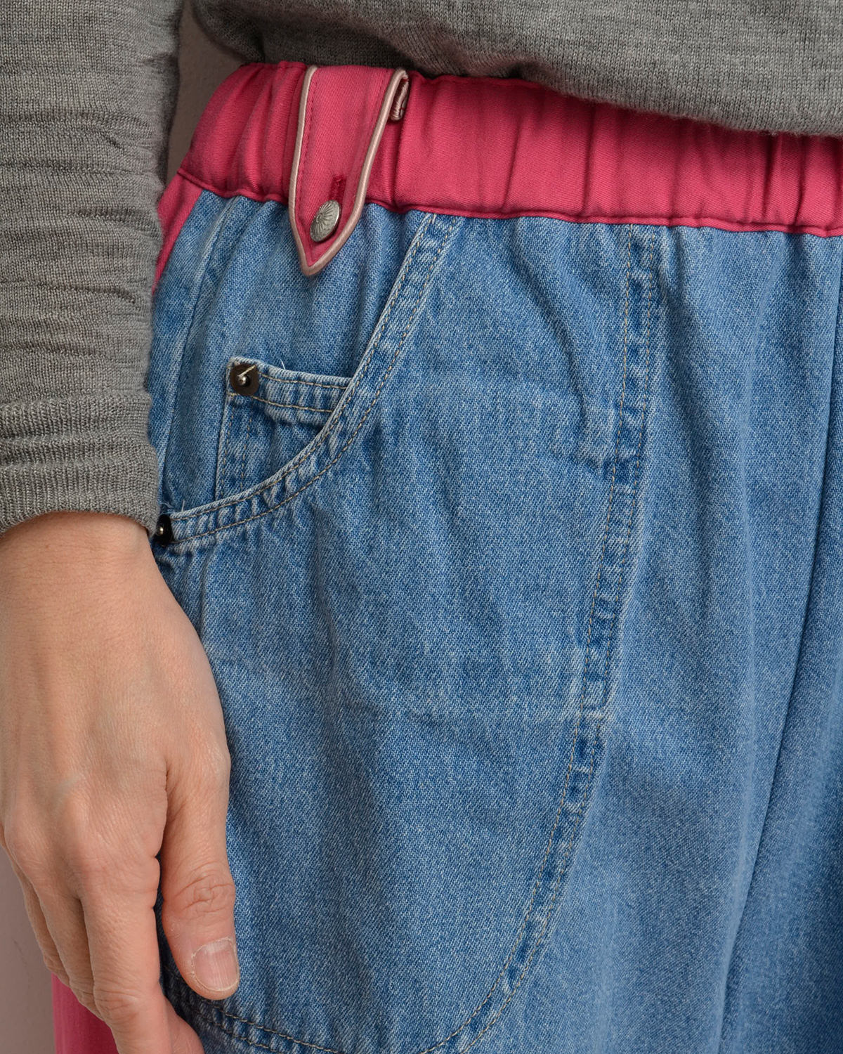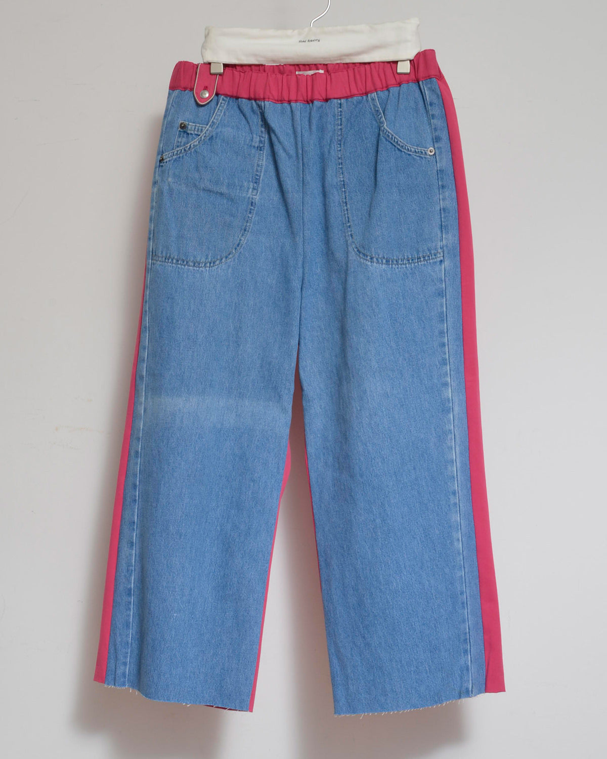 前身頃にはusedデニムのイージーパンツを大胆にそのまま使用し、ポケットも古着のディテールを活かしています。