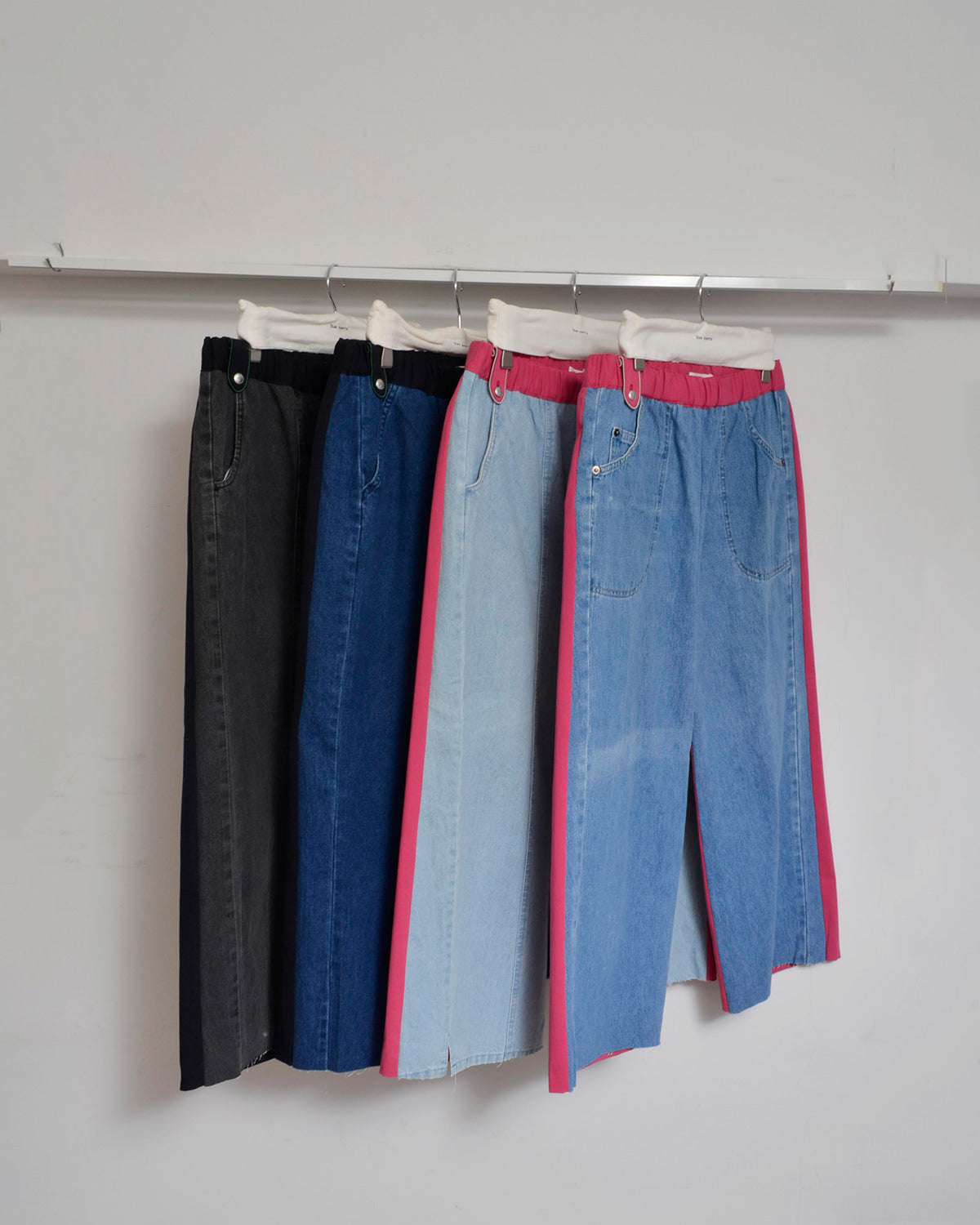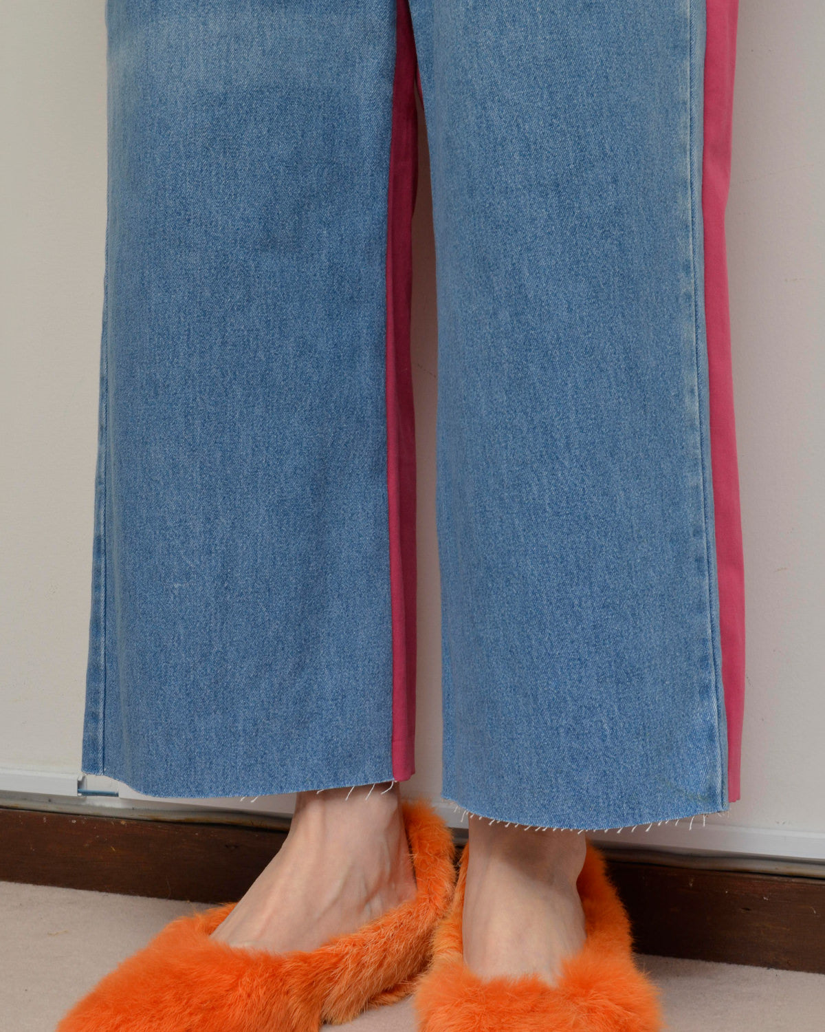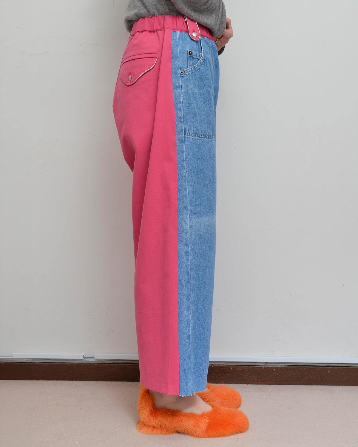 前身頃にはusedデニムのイージーパンツを大胆にそのまま使用し、ポケットも古着のディテールを活かしています。