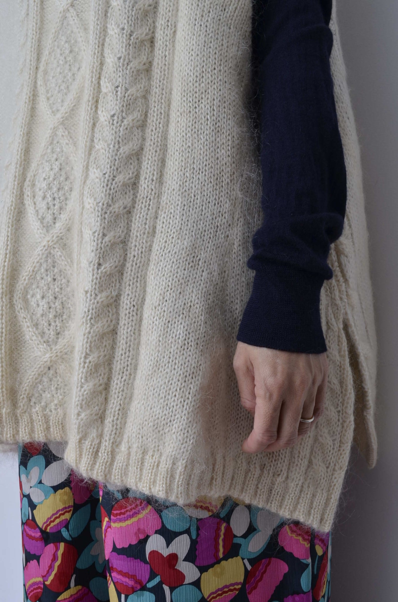 ベストタイプなので、長袖のワンピースやタートルに合わせるのもいいですし、コートの中に着たときに袖がごわごわせずにすっきりします。