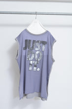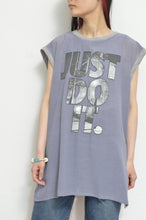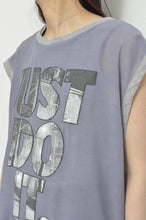 A long T-shirt in which the front body of the used T-shirt is switched to a dry touch voile with a sense of sheerness, and the original printed pattern is placed again on the front body.