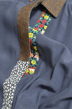 The straight front and trench coat-like upper collar are made from dismantled parts of a used floral dress.