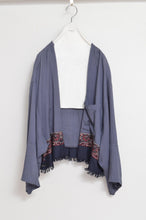 usedシャツをショート丈にカットし、裾にusedスカーフの端をフリンジのように付けたショートシャツ。