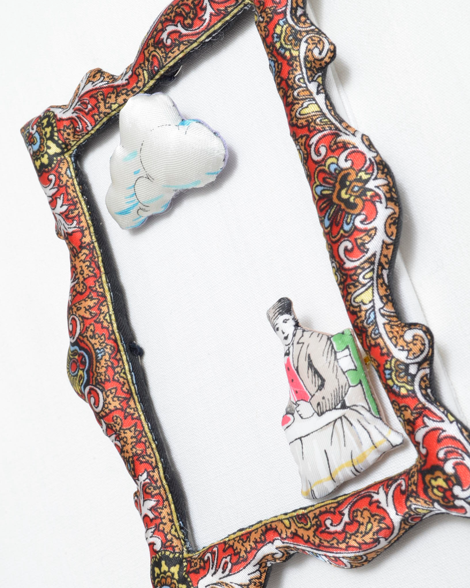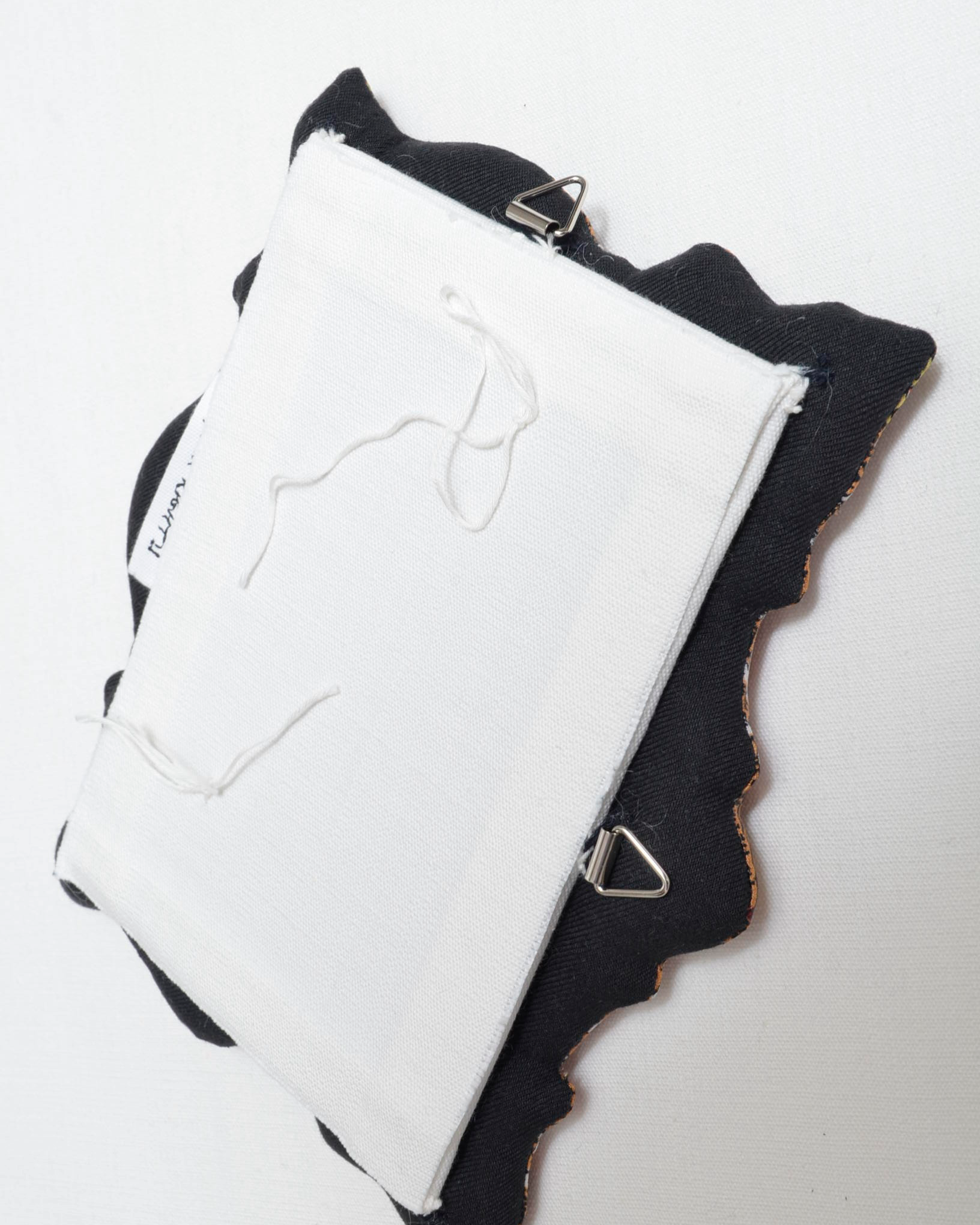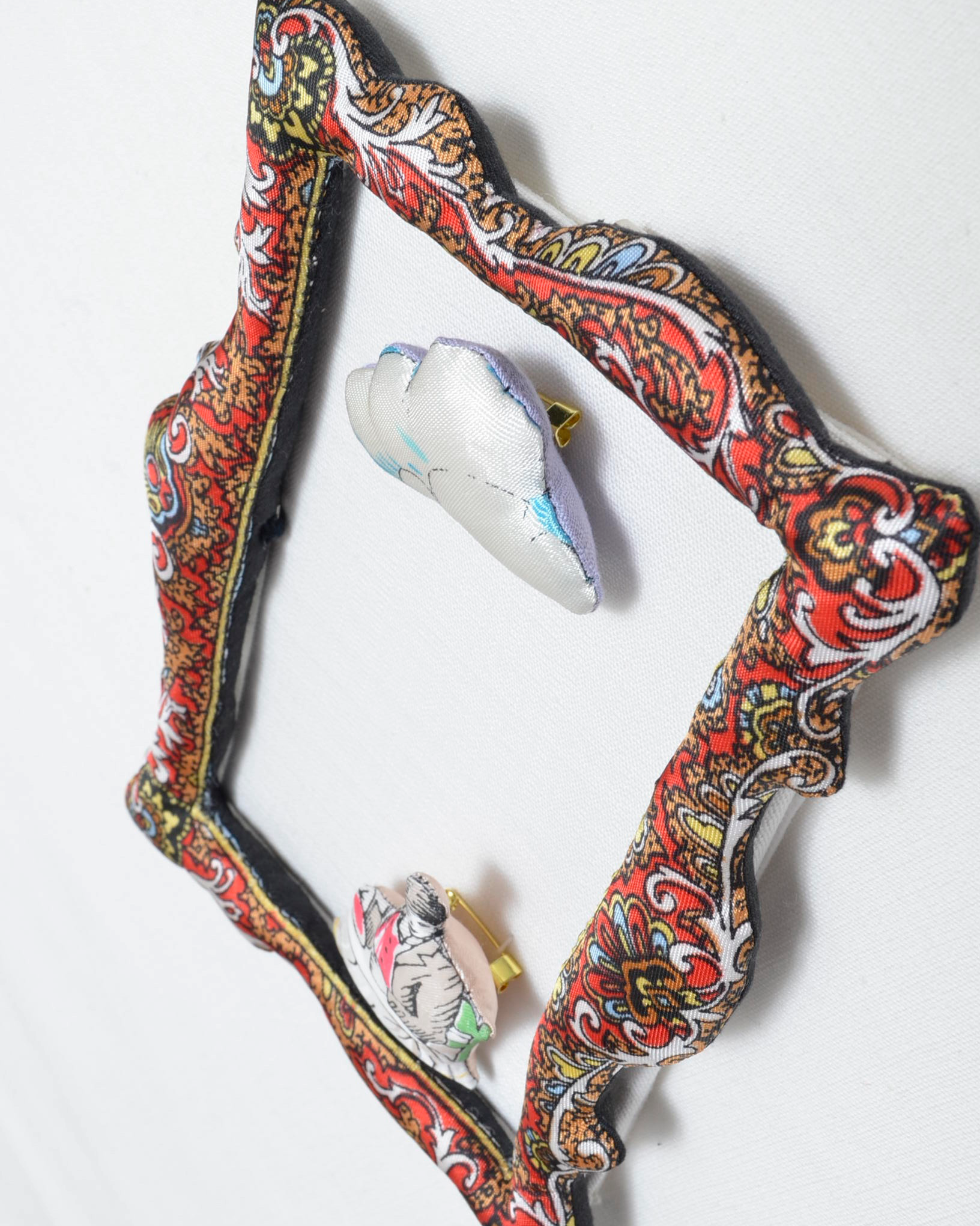 額縁や小さなモチーフとして立体化することで、布が本来持つ輪郭と記憶を新しいかたちへと再構成しています。