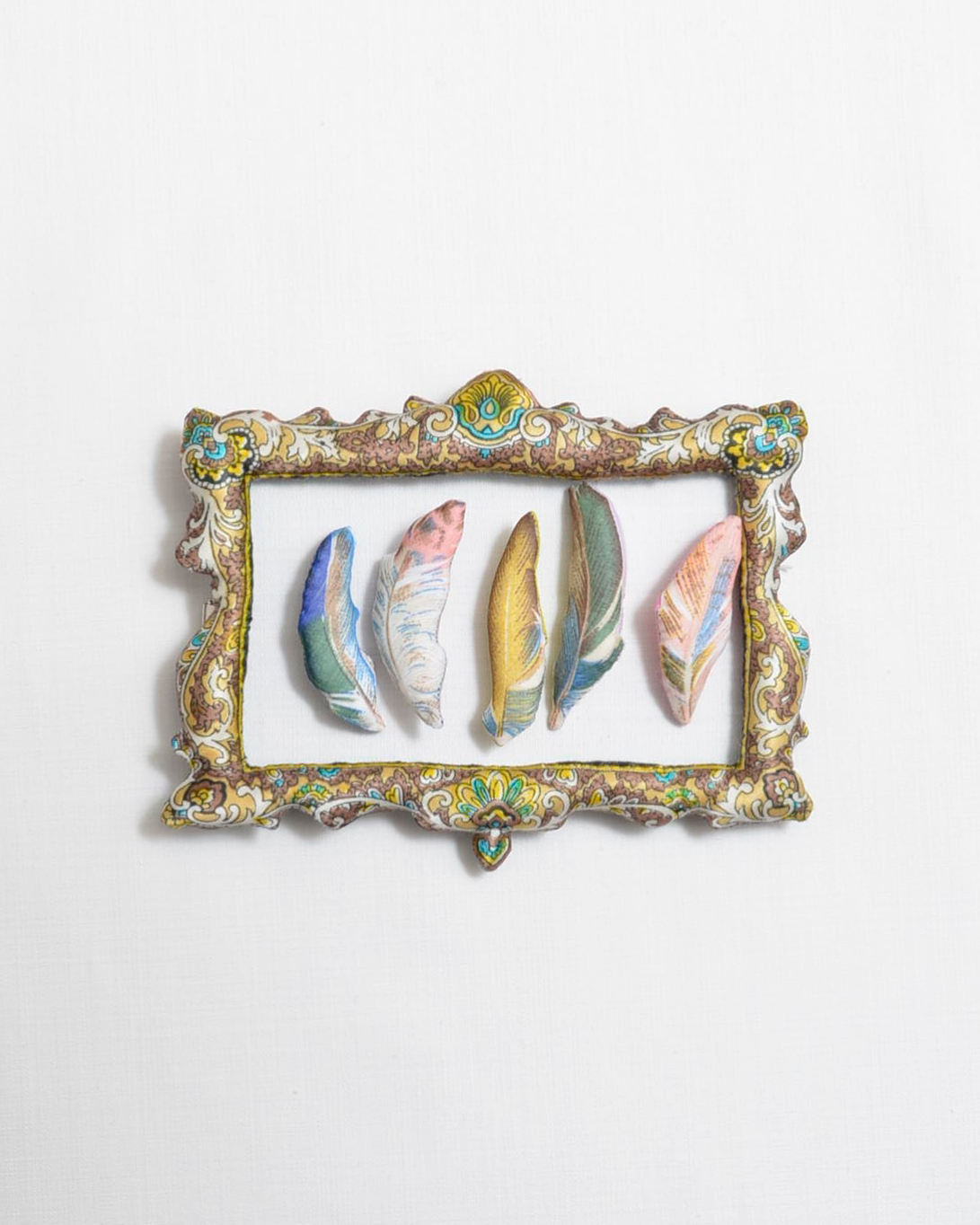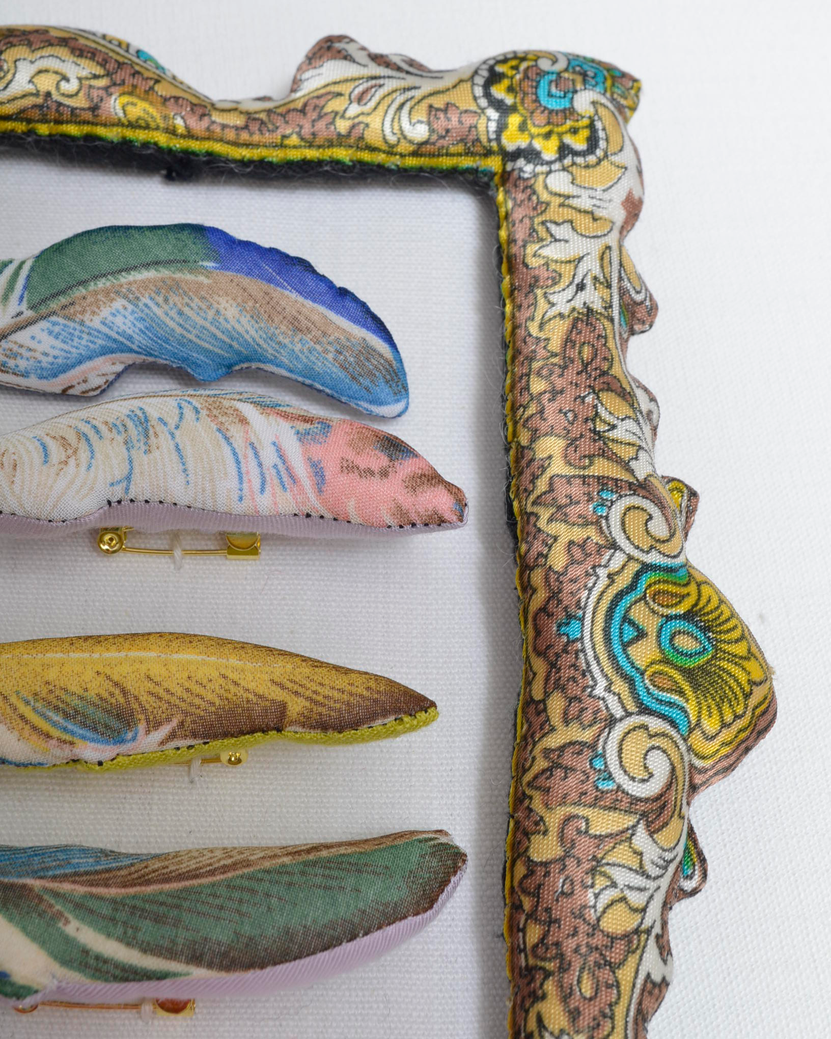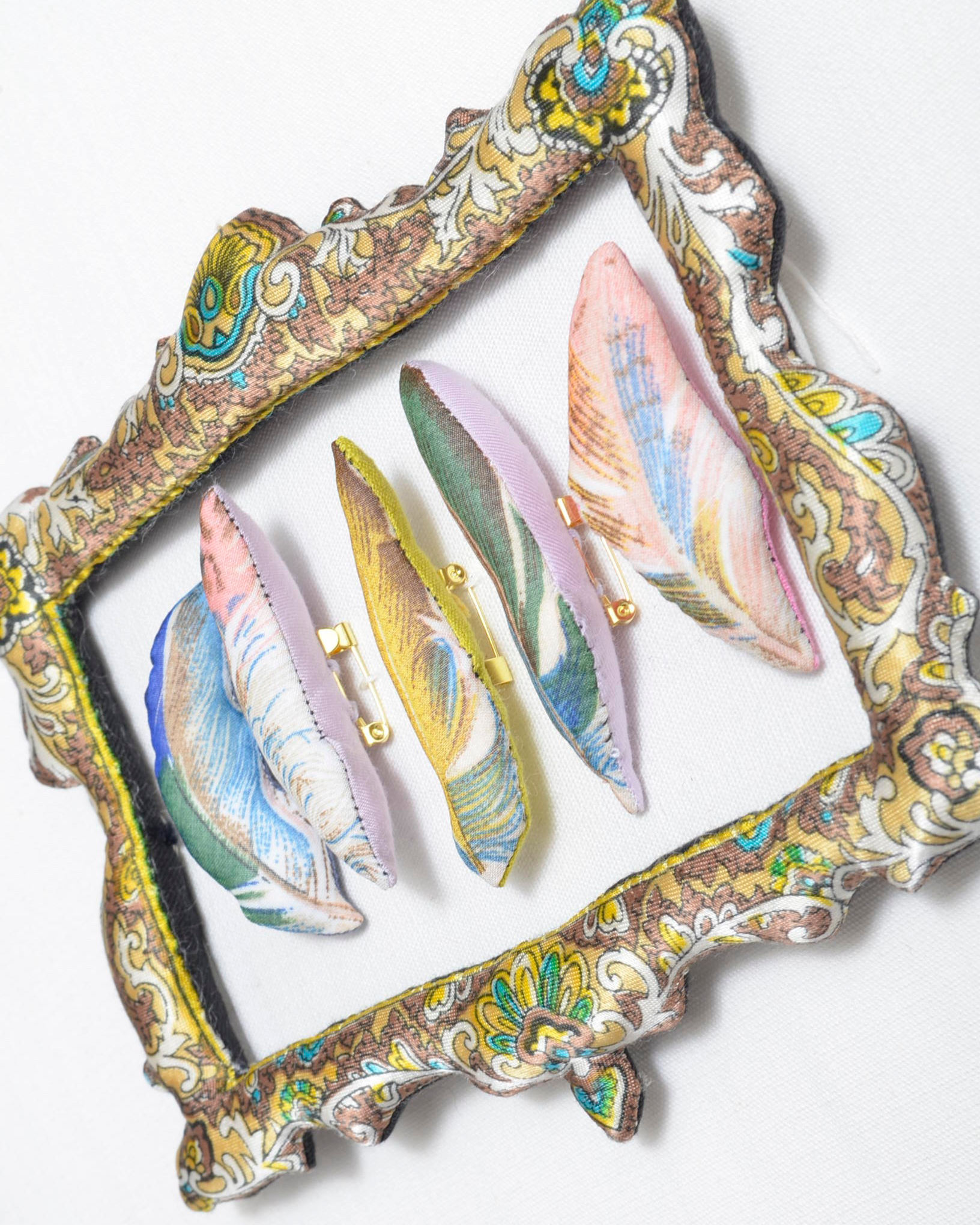 usedスカーフの特徴的できれいなペイズリーのような模様を切り抜いたフレームに、美しい色合いの羽根ブローチを並べた標本のような作品。