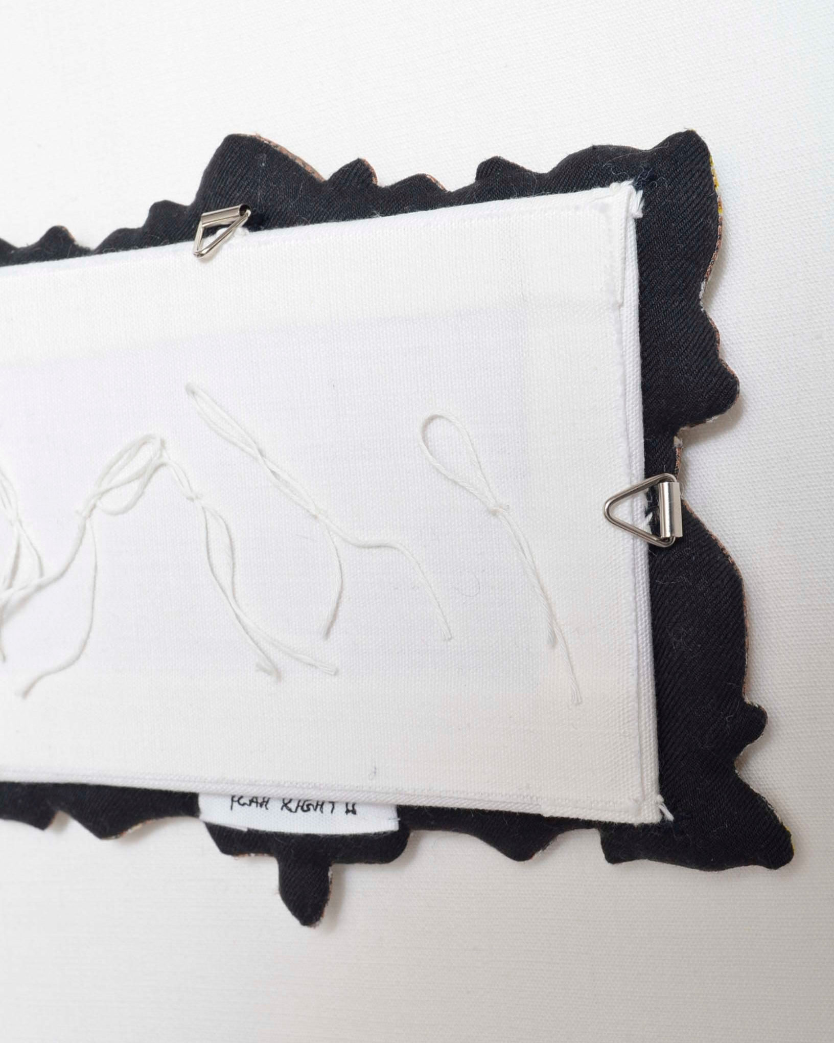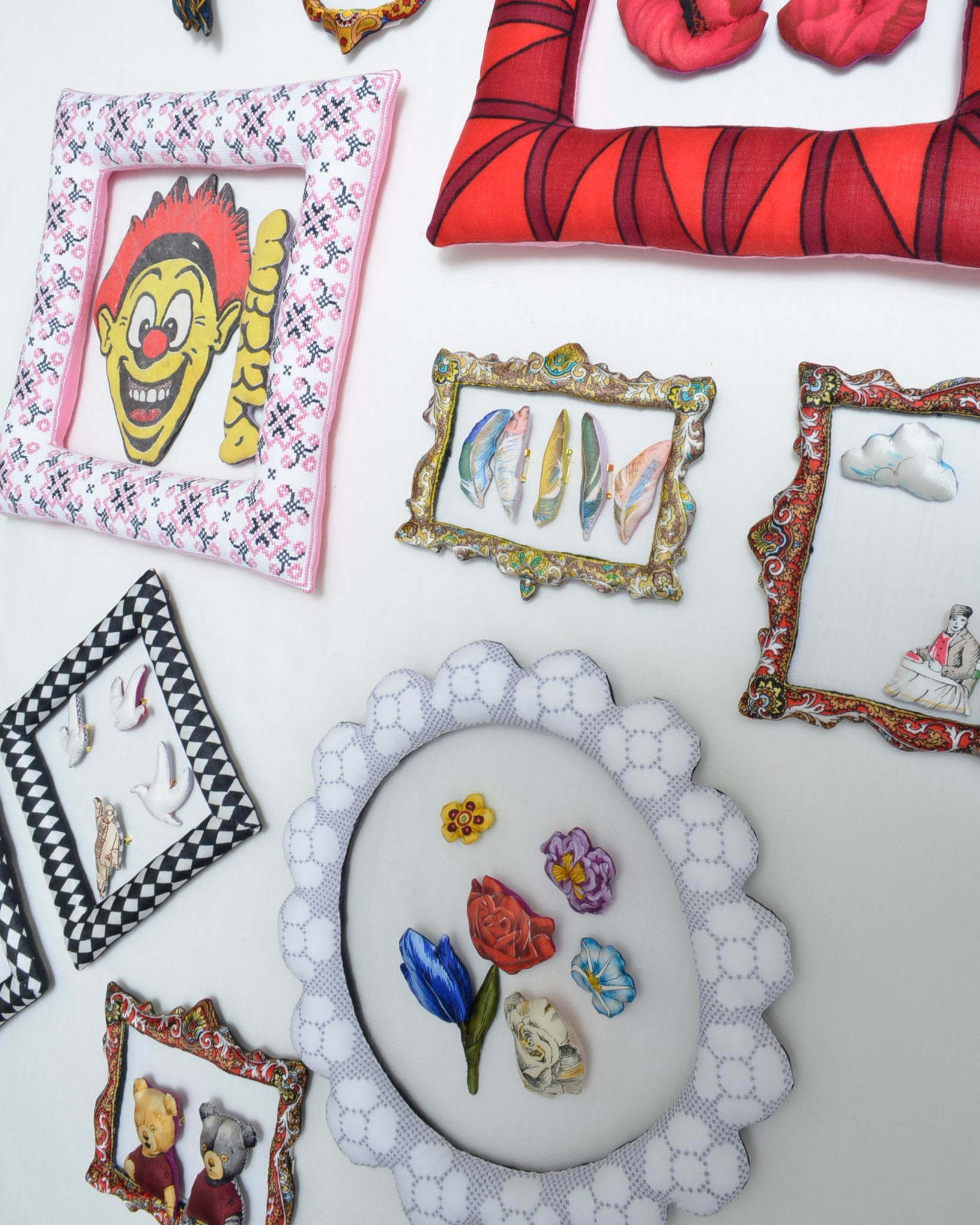 額縁や小さなモチーフとして立体化することで、布が本来持つ輪郭と記憶を新しいかたちへと再構成しています。