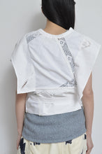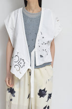 usedテーブルクロスを解体しオリジナルパターンで仕立てたカシュクールカーディガン。