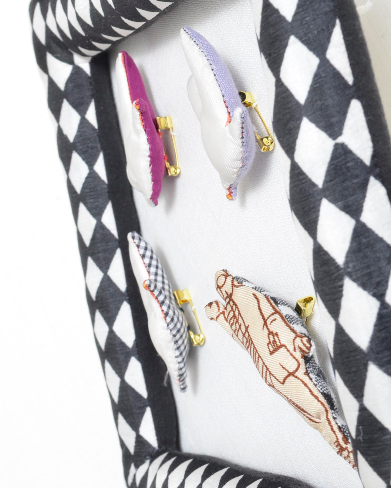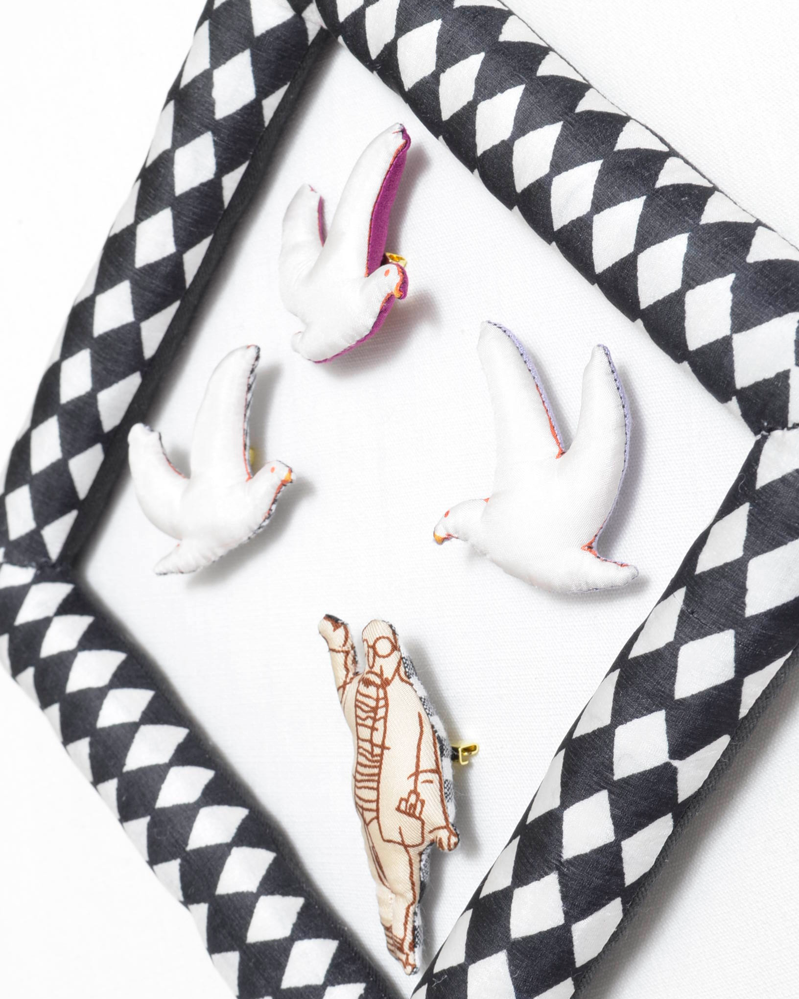 usedスカーフを切り抜いたひし形フレームに、三羽の鳩、おちゃめな紳士のバランスがユニーク。
