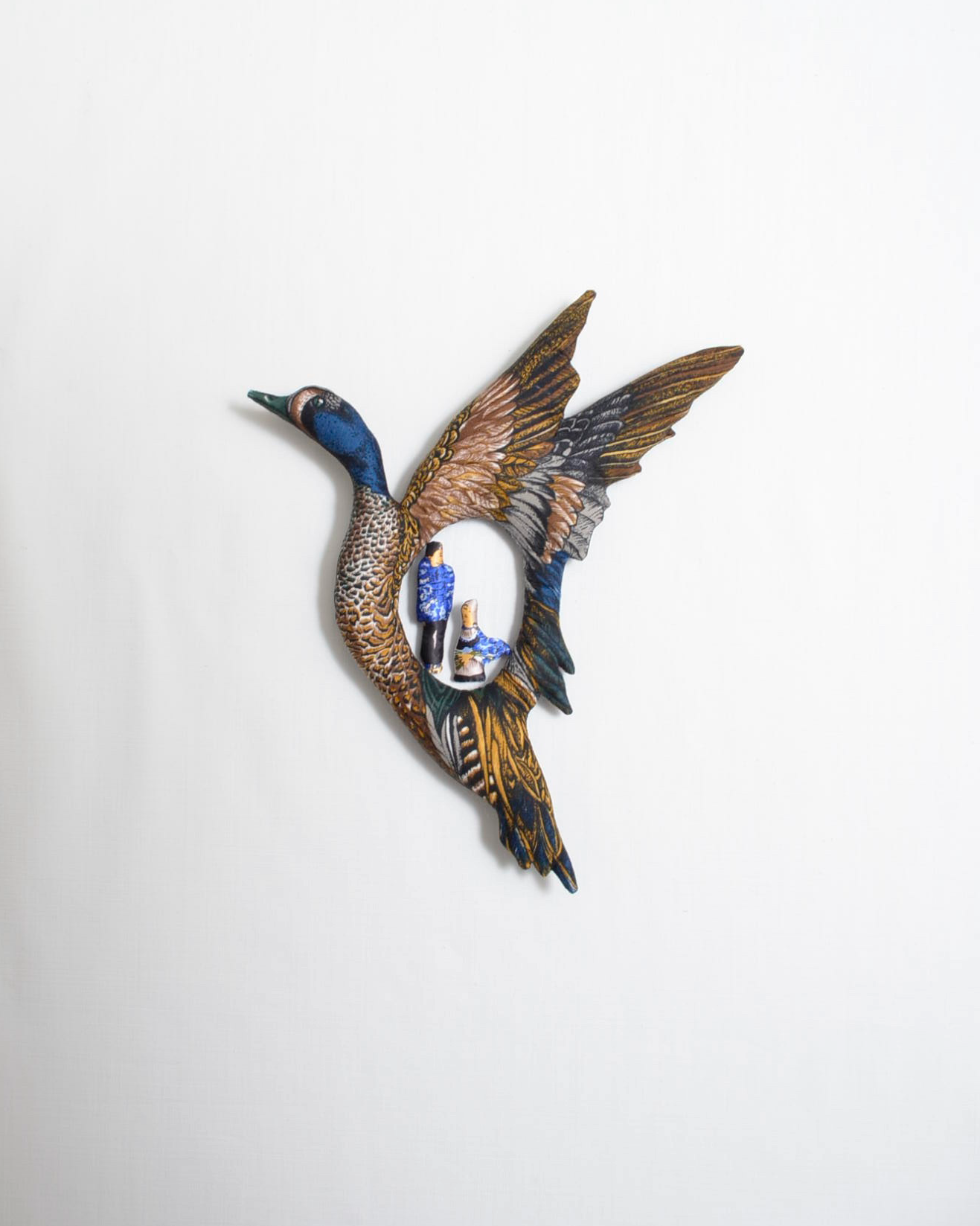 鴨(DUPE)のフレームの中に青い花束を抱えたふたりのブローチ。