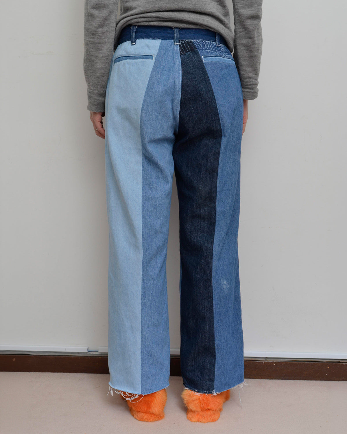 usedイージーパンツを解体・再構成し、ウエストゴムの痕跡を活かした独自のパネルワークがポイント。