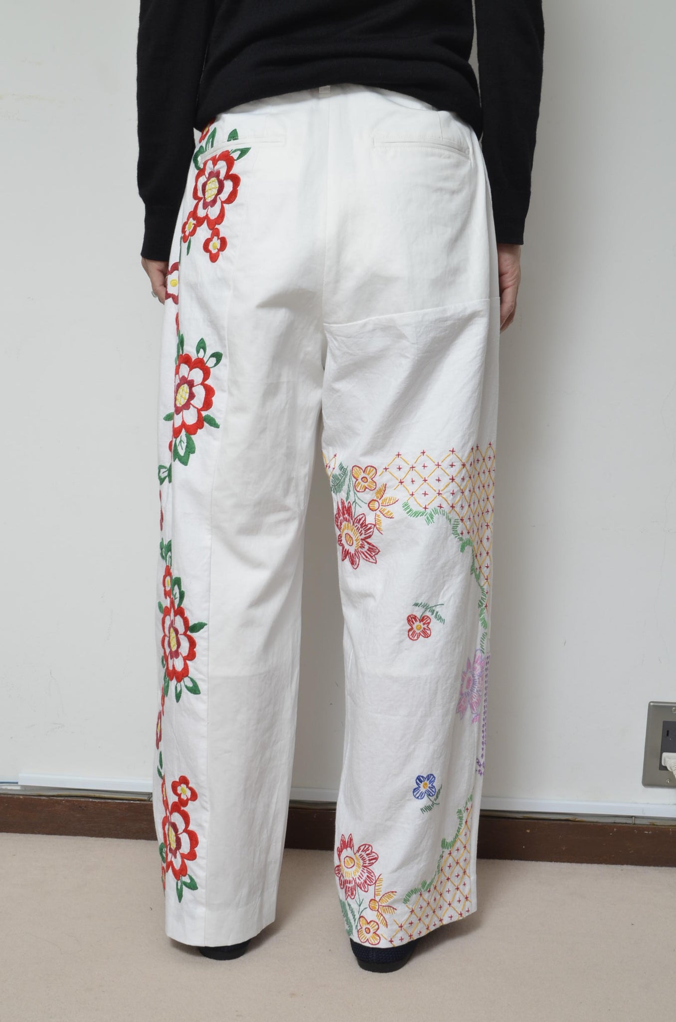前開きはファスナーとホック。腰ポケットと後ろ玉縁ポケット付き。