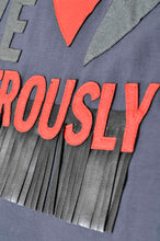 プリント柄に挟み込んだレザー風ロングフリンジが揺れています。