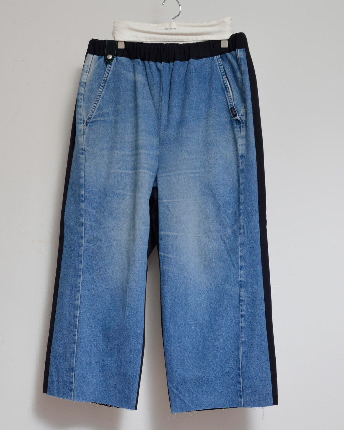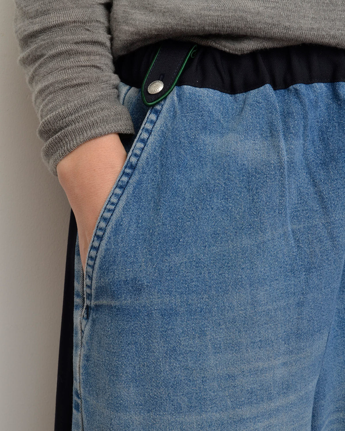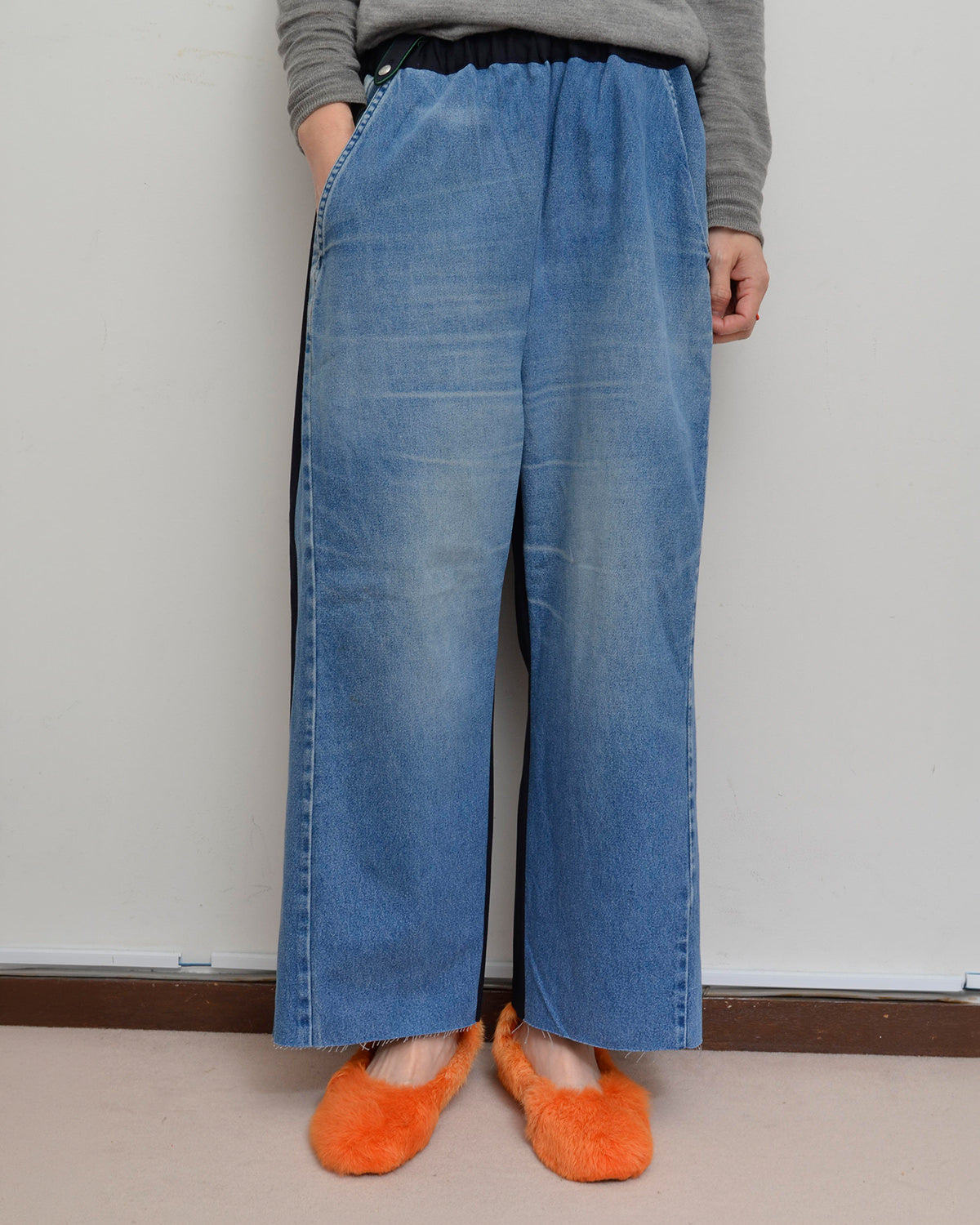 前身頃にはusedデニムのイージーパンツを大胆にそのまま使用し、ポケットも古着のディテールを活かしています。