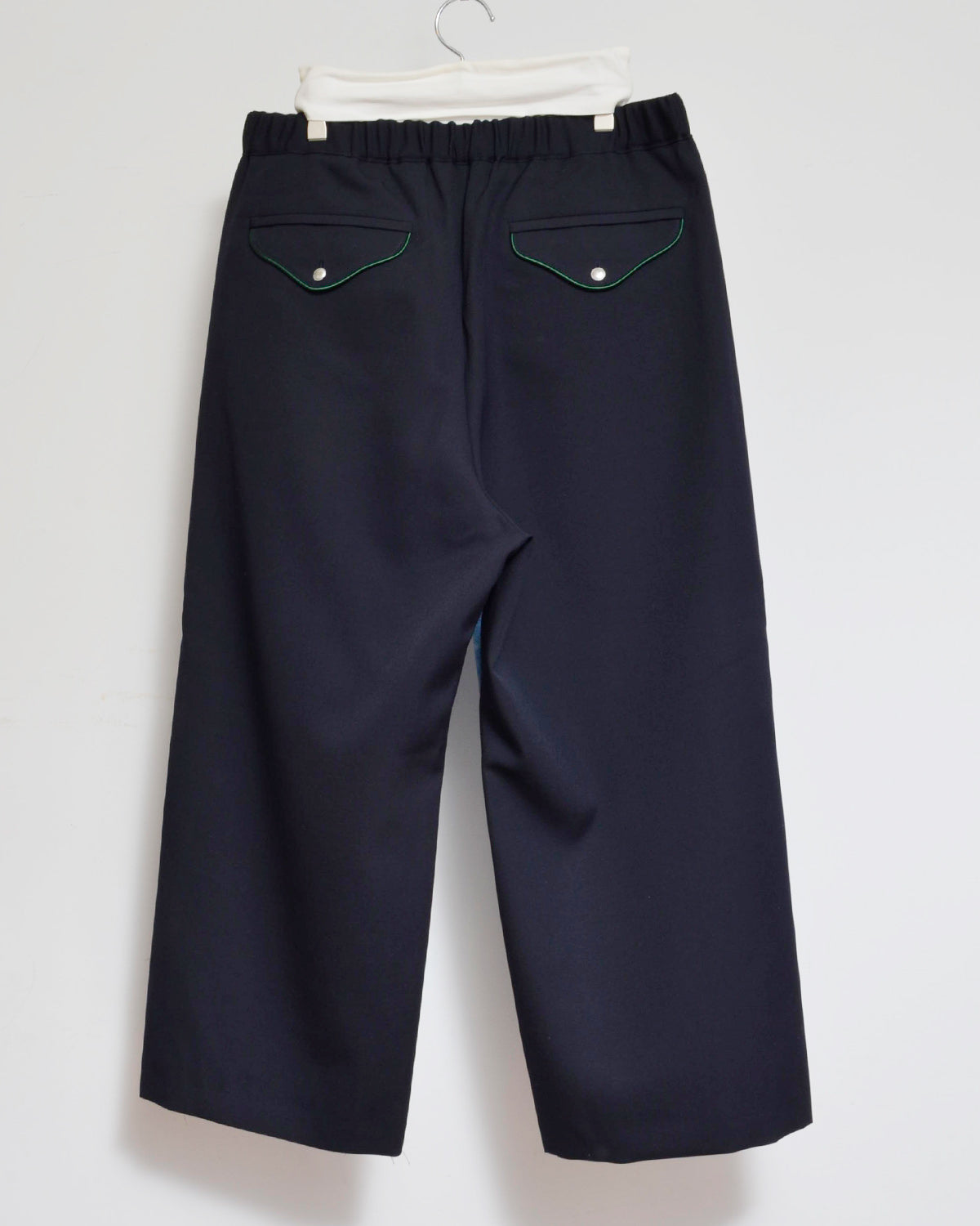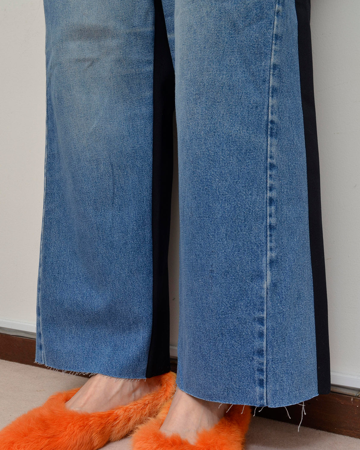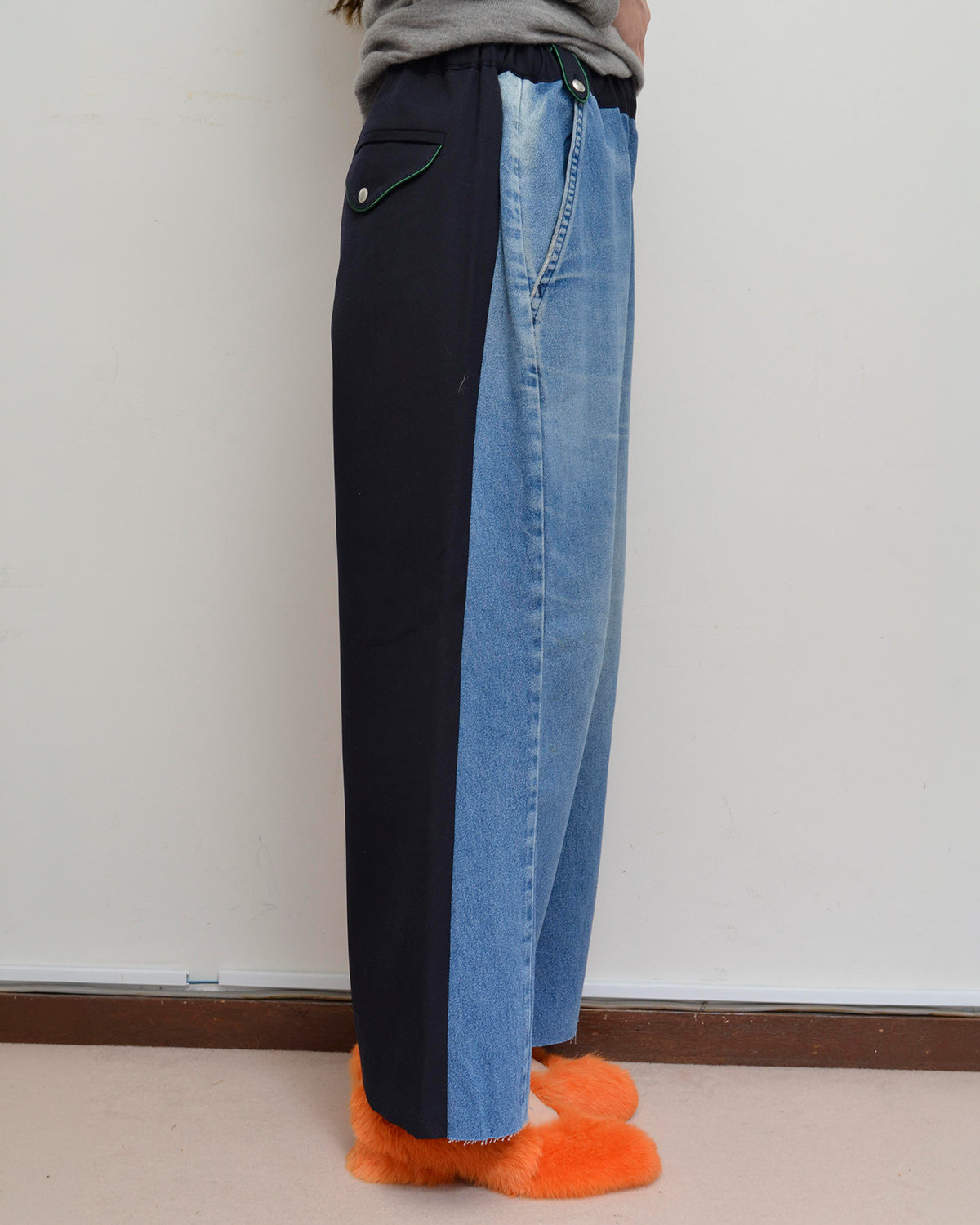 前身頃にはusedデニムのイージーパンツを大胆にそのまま使用し、ポケットも古着のディテールを活かしています。